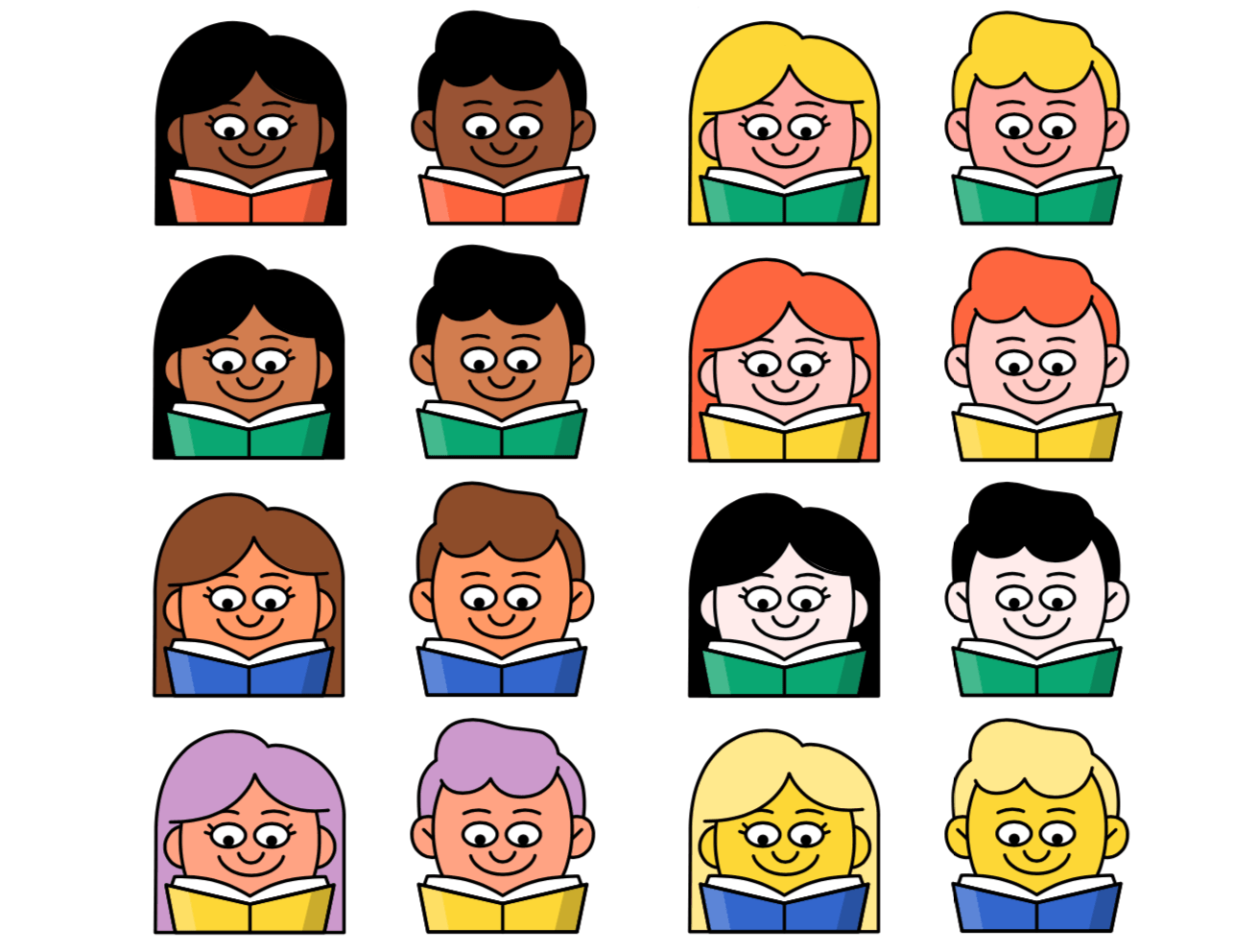 Working on a small scale, Dan used his trademark, retro style to create a variety of different emojis for people to use to express reading. These fun, character-filled emojis capture the ups & downs of a good read while also showing a mix of reading characters in different skin tones.