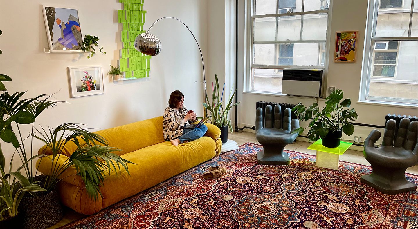 Located in a well known art deco building in the heart of Tribeca, you’ll find stunning views of the downtown NY skyline and a big yellow couch that invites you to sit down and stay awhile.