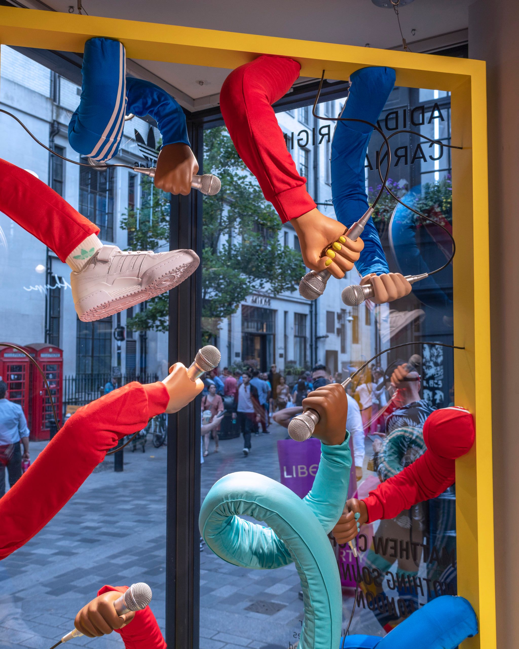 The concept for the window was to pay homage to the brand’s presence in hip-hop culture, featuring arms and legs twisting into the window frame leaving a space for people to walk in and strike a pose!