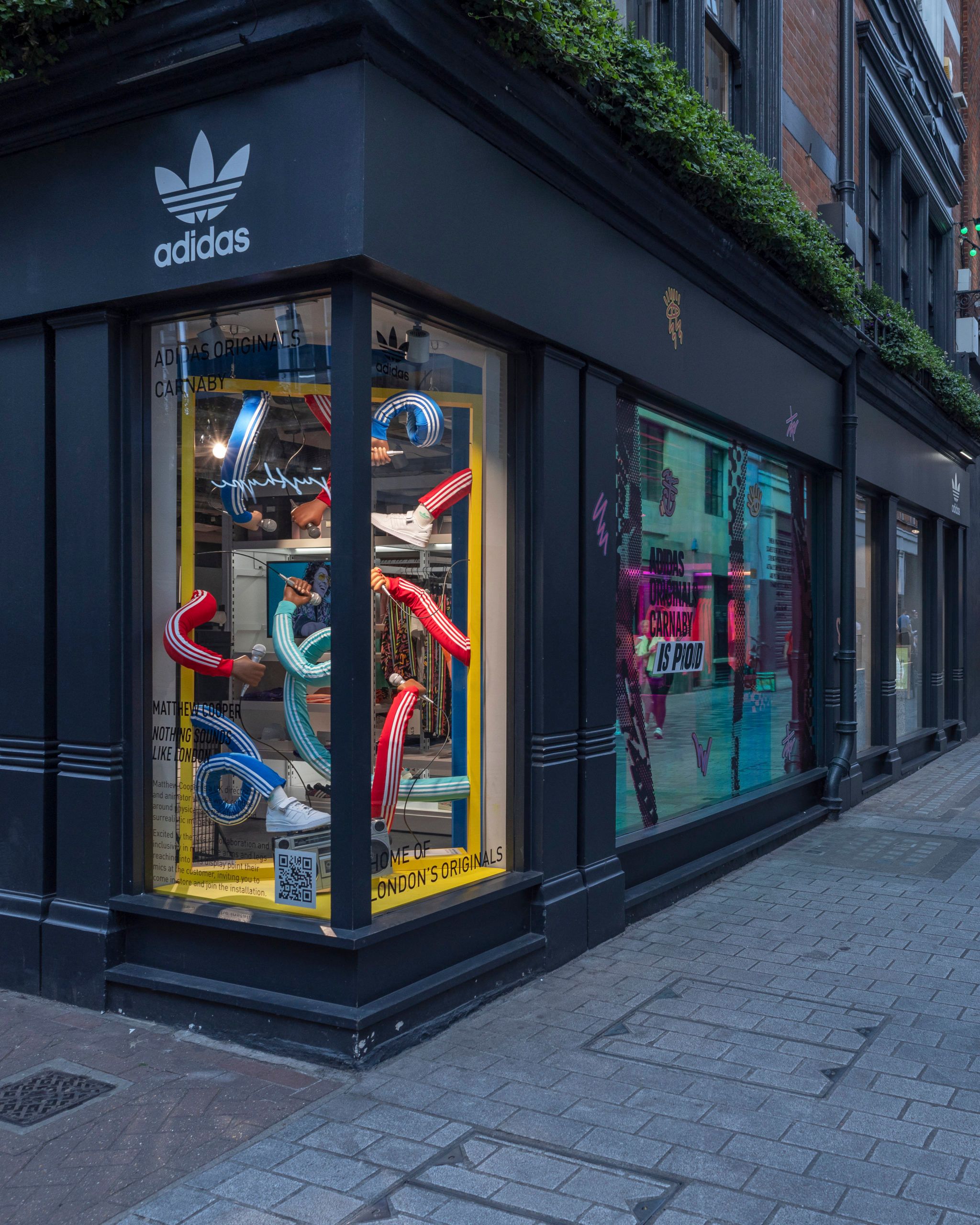 Matte used his quirky design style to create the elongated limbs for the display with his familiar bright colour palette, blending his style with the recognisable branding of Adidas.