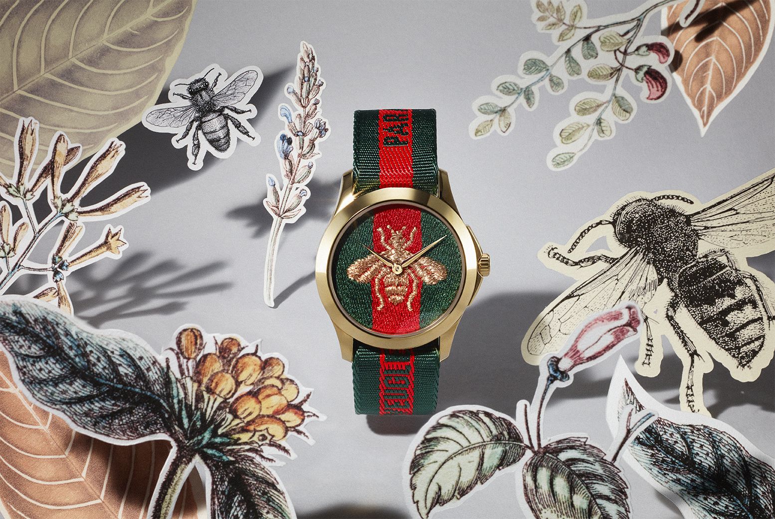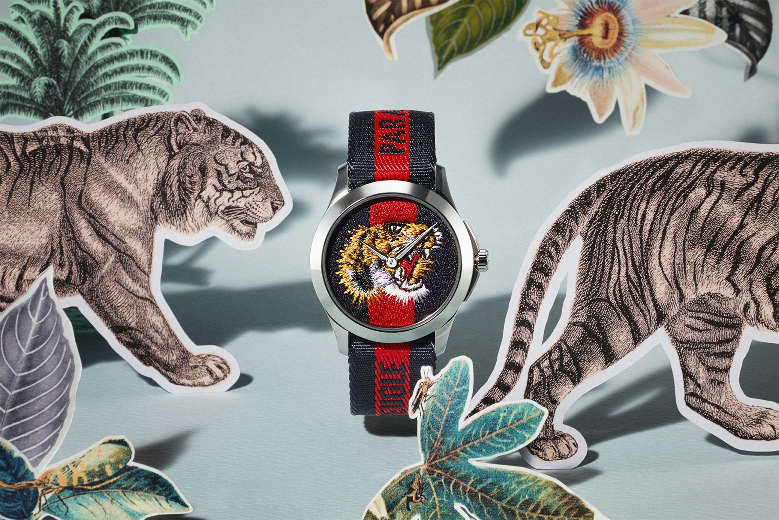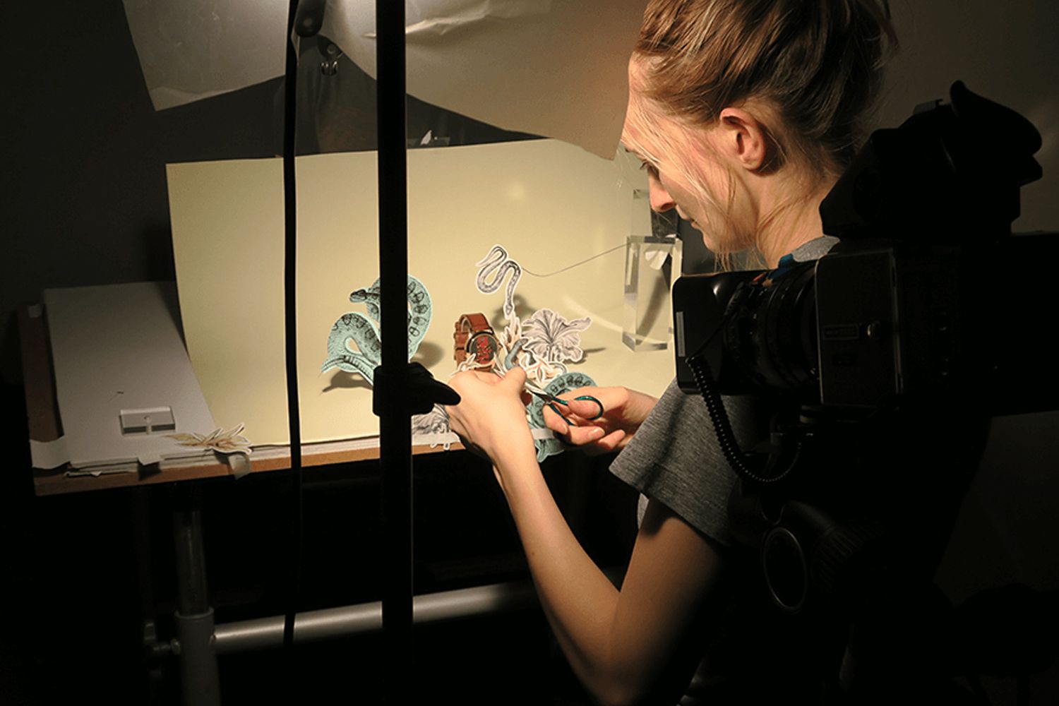 Hattie worked with paper to create three nature-inspired intricate sets for British Vogue starring new watches by Gucci.