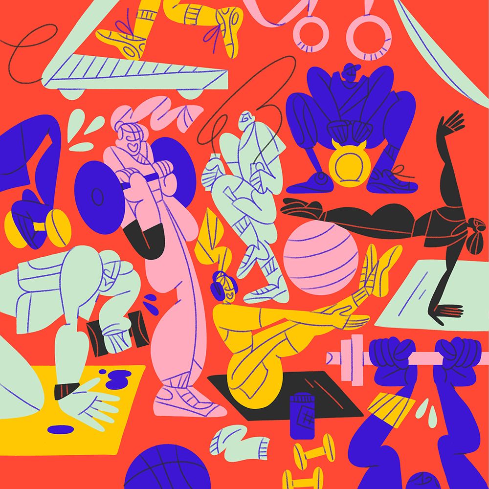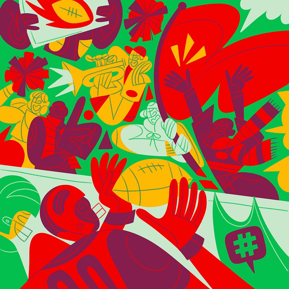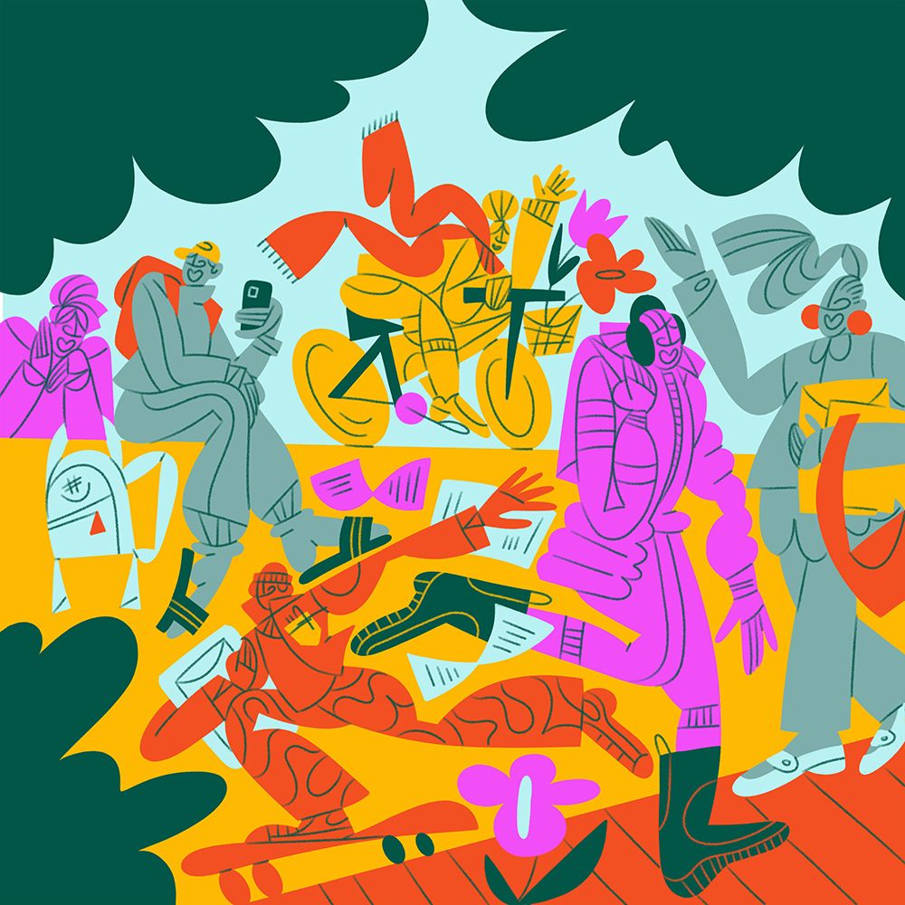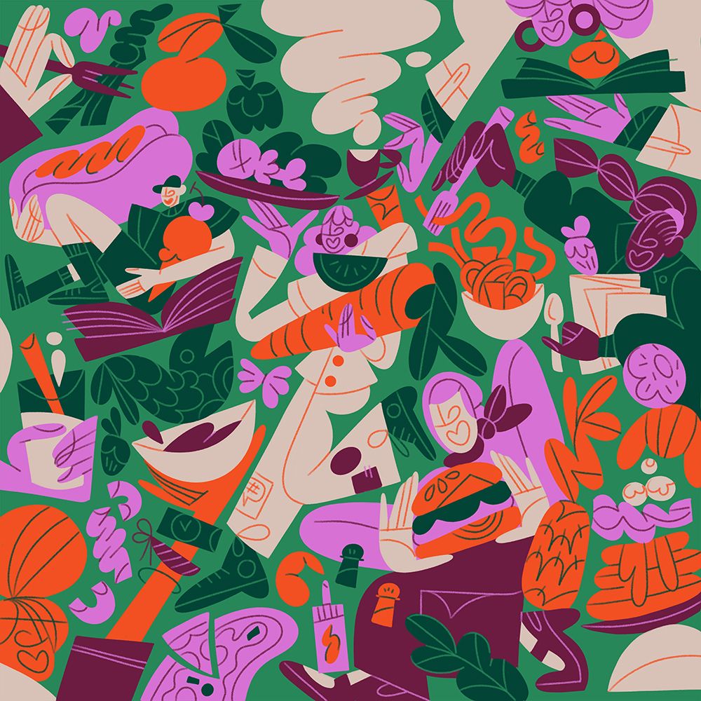 Focusing on the concept of shared experiences and community, Meredith’s designs are bold and expressive with an emphasis on bringing groups together, her signature dynamic characters are depicted in various social situations that can be used across the app from parties to brunches and sporting events.