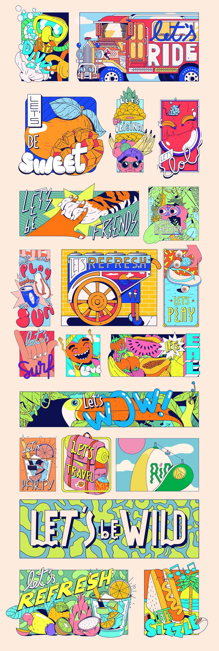 Each poster, referenced comic book layouts or sticker packs, would work as a huge Key Visual delivering tons of illustration for social media and sales points. Each layouts all had a different moods to celebrate summer and each module would have specific illustrations with original lettering.