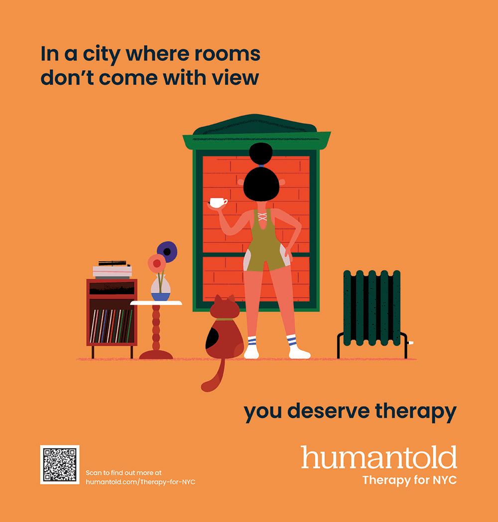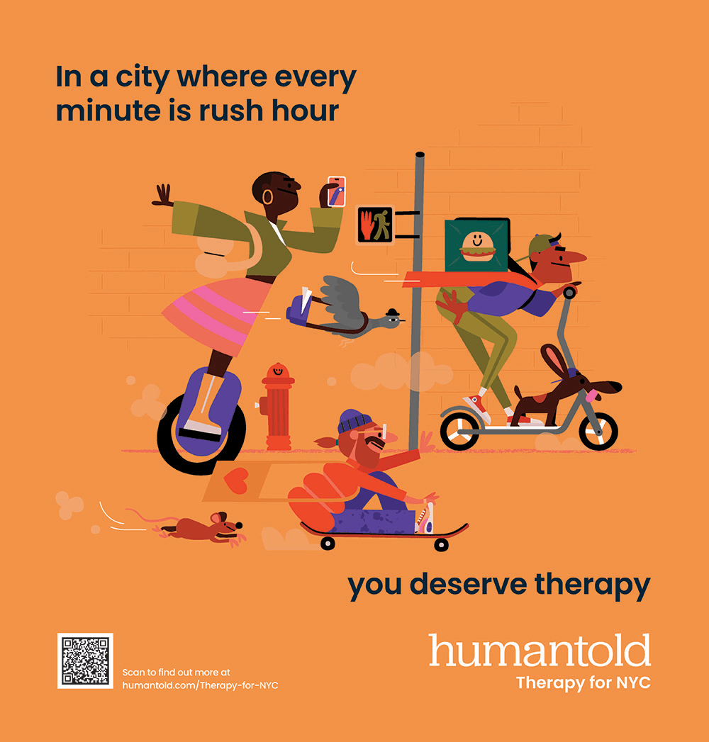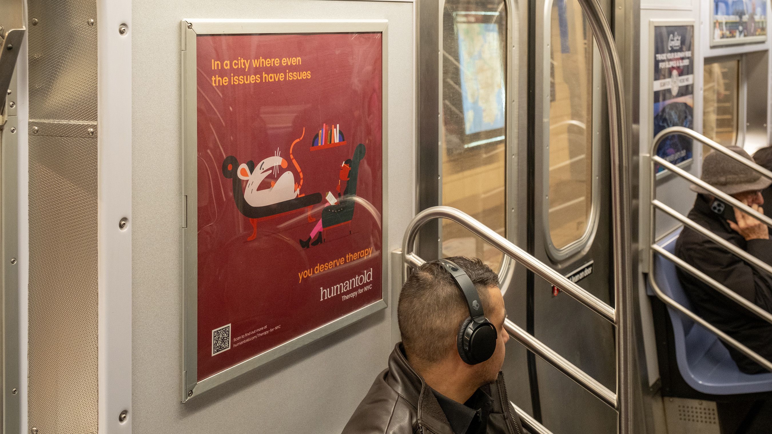 Characterful illustrator Alex Tait worked with Humantold, a company driven to provide access to high quality, affordable mental health care to all New Yorkers, helping ease the everyday stresses of living in the bustling city. To introduce the brand to its audience Alex designed charming illustrations to be used across out of home focusing on the iconic New York subway system, aiming to catch people in moments of stillness from their busy lives.