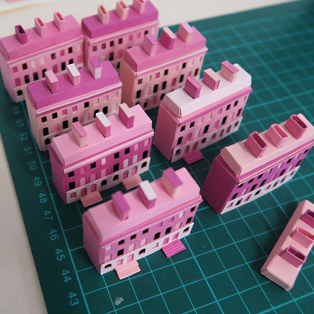 Given a fairly open brief, Hattie came up with the idea to create a miniature town at dusk, featuring little paper houses nestled together and surrounded by frosty fields and forests.
