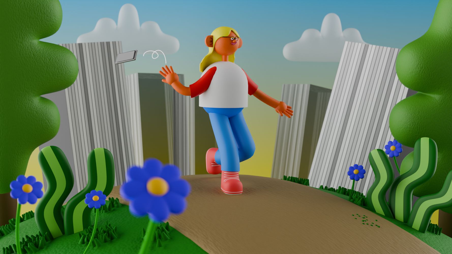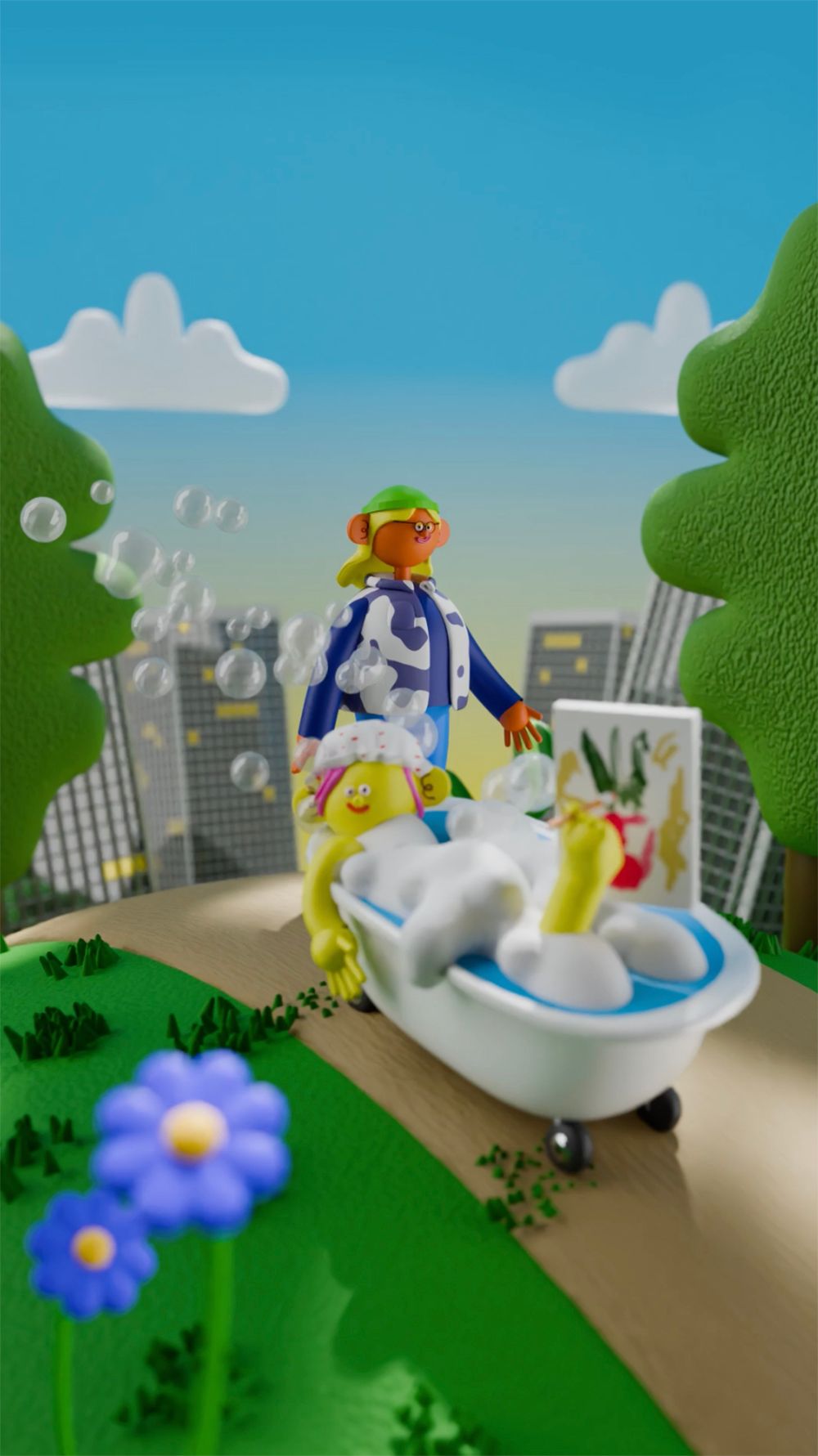 When designing the environment, Leanne took a step away from her recognisable shiny, plastic texture for a slightly more realistic design to have a more ‘grown up’ feel befitting of the subject, while still existing within the same universe as her usual work.