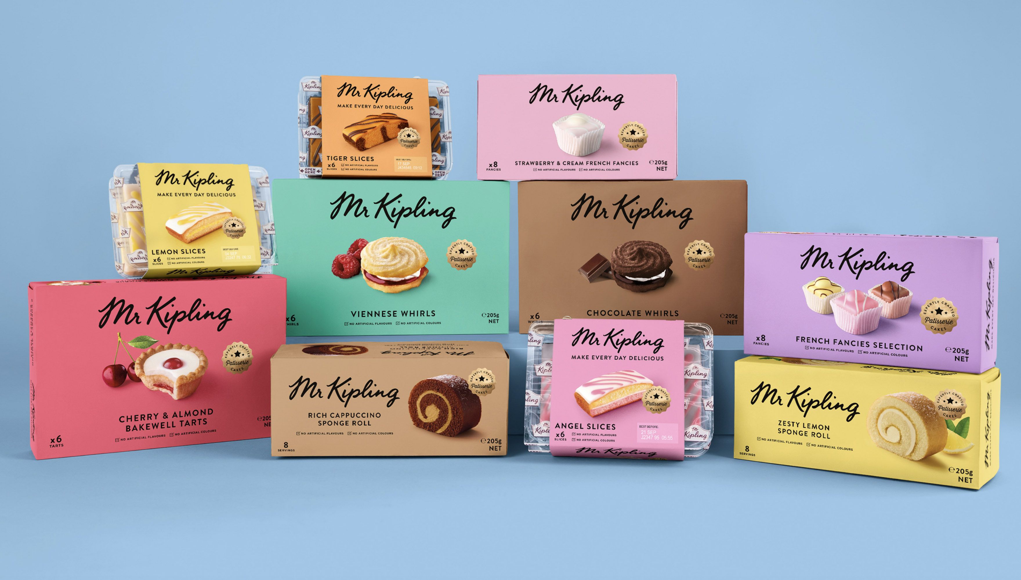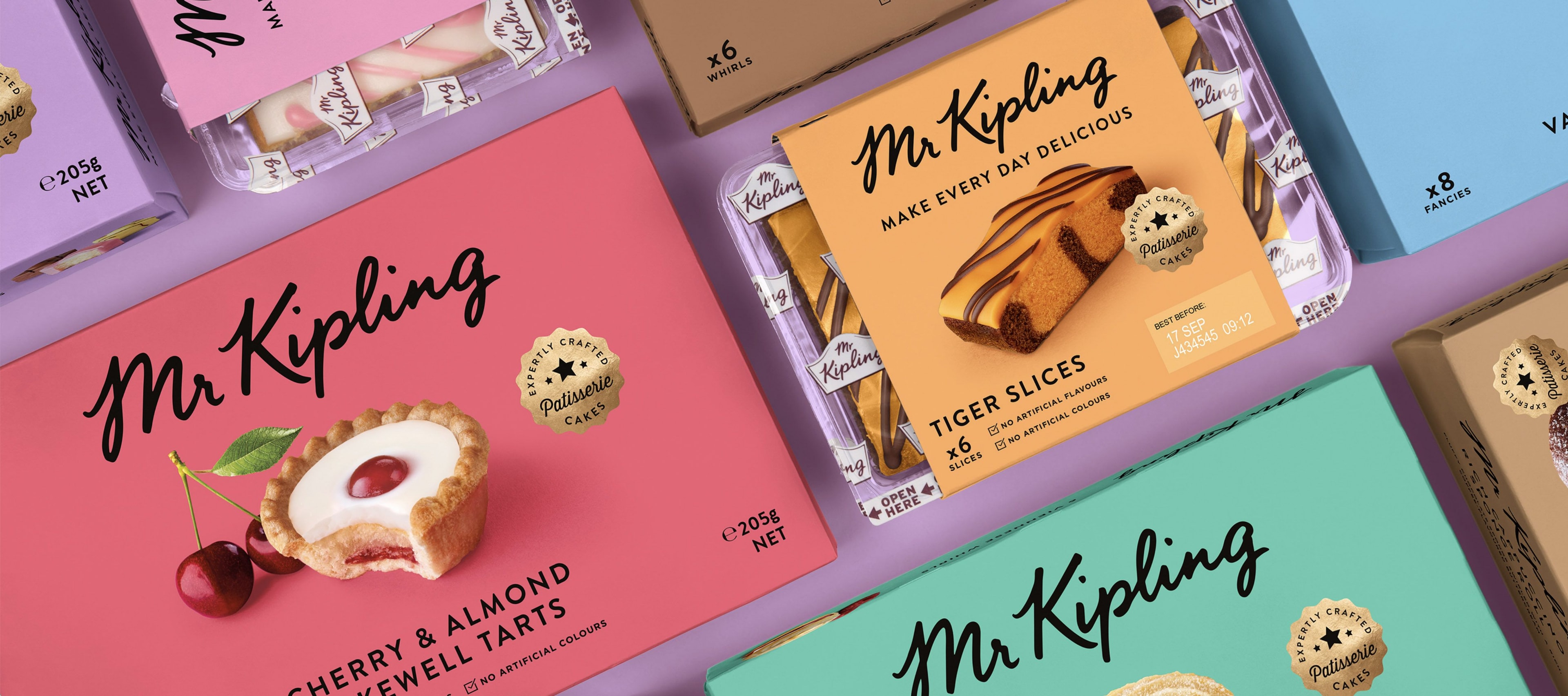 In 2018 Studio Robot Food redesigned Mr Kipling’s branding and packaging, taking inspiration from European patisseries. Alison’s brandmark was refreshed, and is now a flat, black colour, printed directly on the coloured background, rather than on a light-coloured label as in previous designs.