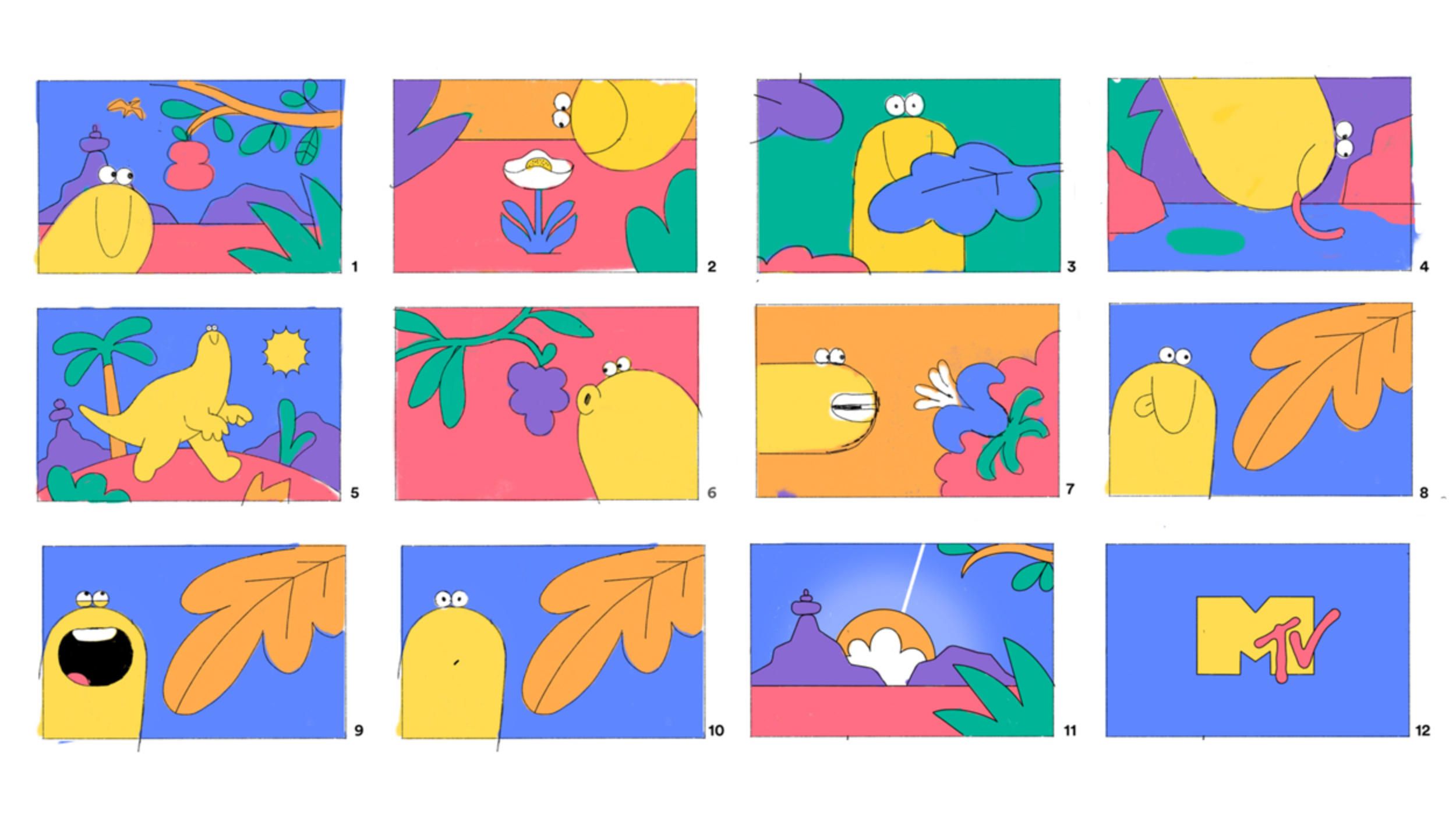 The first couple of ideas he developed weren’t quite right stylistically as he wanted to make something that gave off more ‘retro’ MTV vibes. One day while comfort watching old movies, he stumbled upon a scene from Jurassic Park which sparked the dinosaur concept that became the final ident!