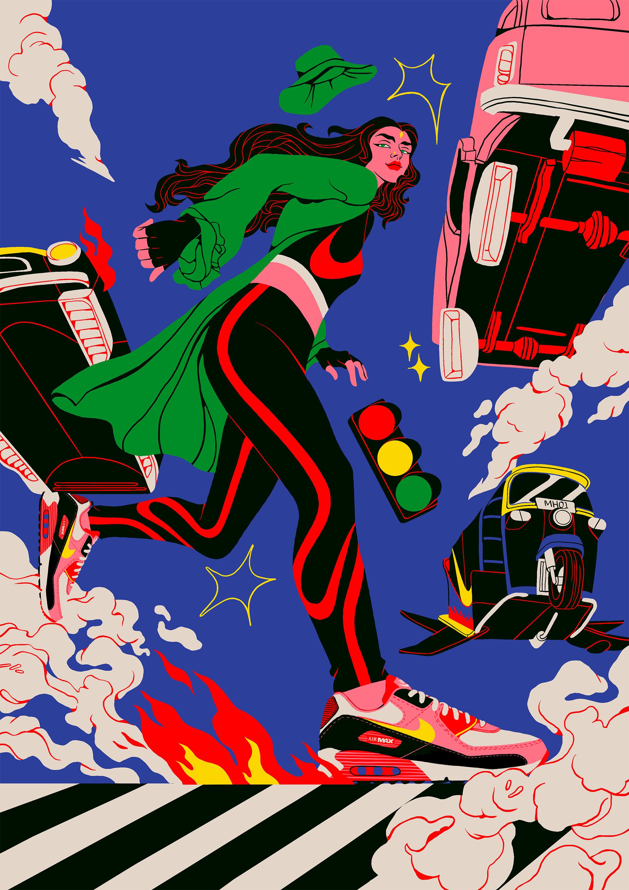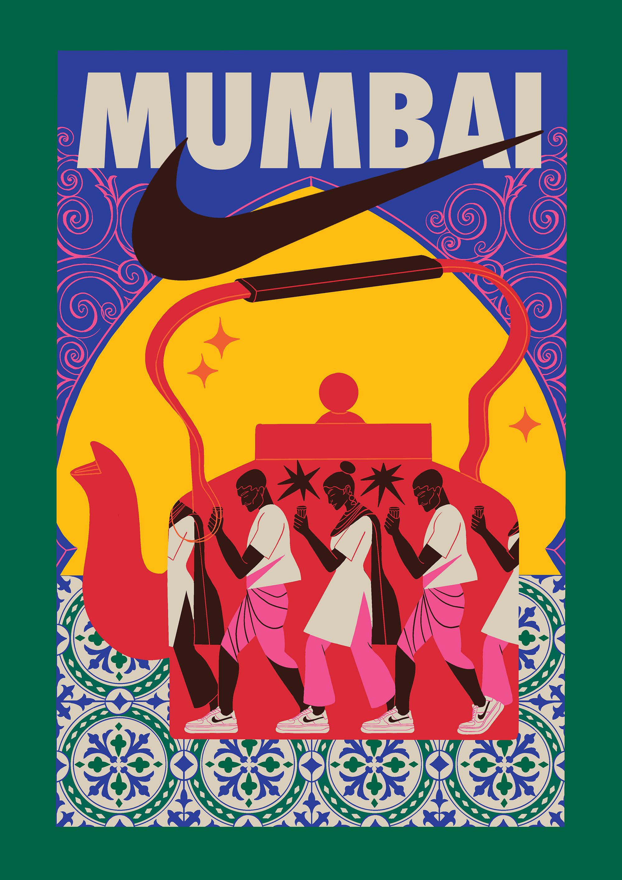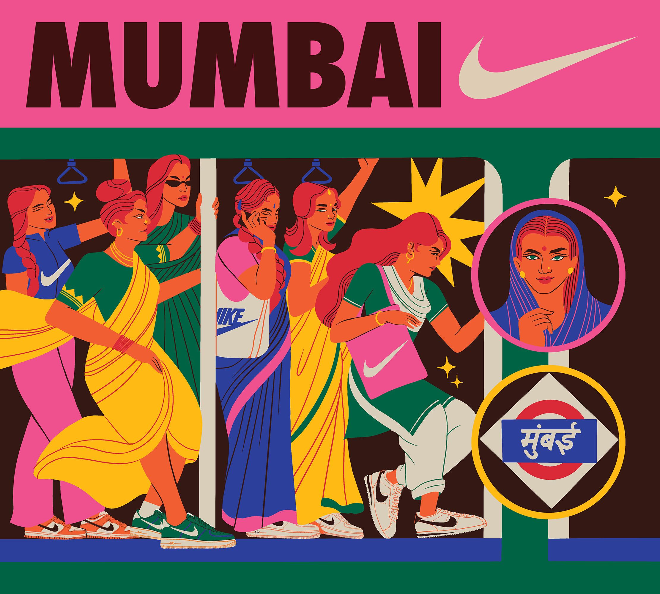 The illustrations depict Mumbai as an alternate future, rooted in its rich, extravagant cultural history and fuelled by technology. Depicting an optimistic worldview, Boomranng portray scenes of life with an unexpected twist, all keeping the iconic Nike design front & centre, from energetic dance-offs to bustling train journeys and a circus of animatronic animals.