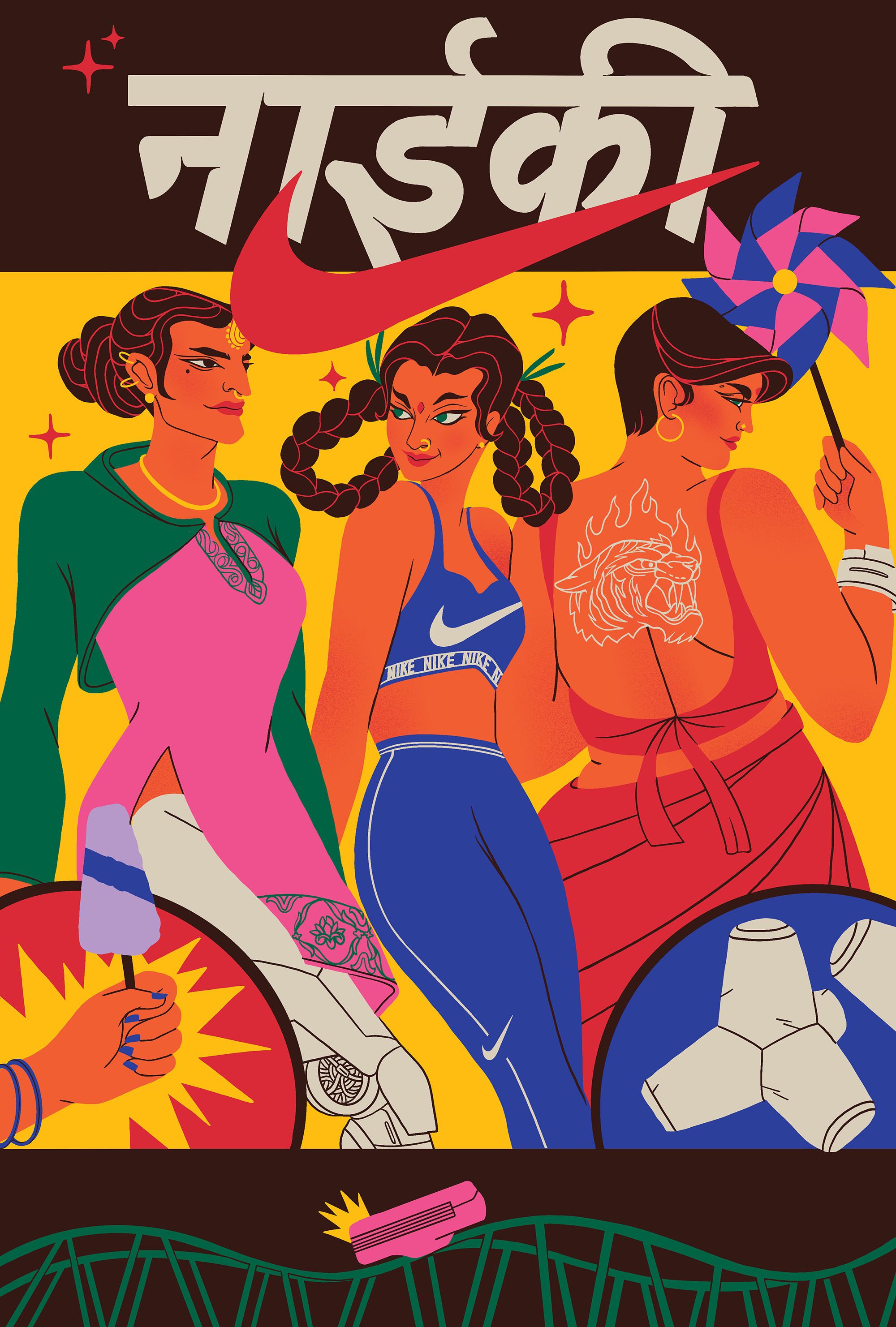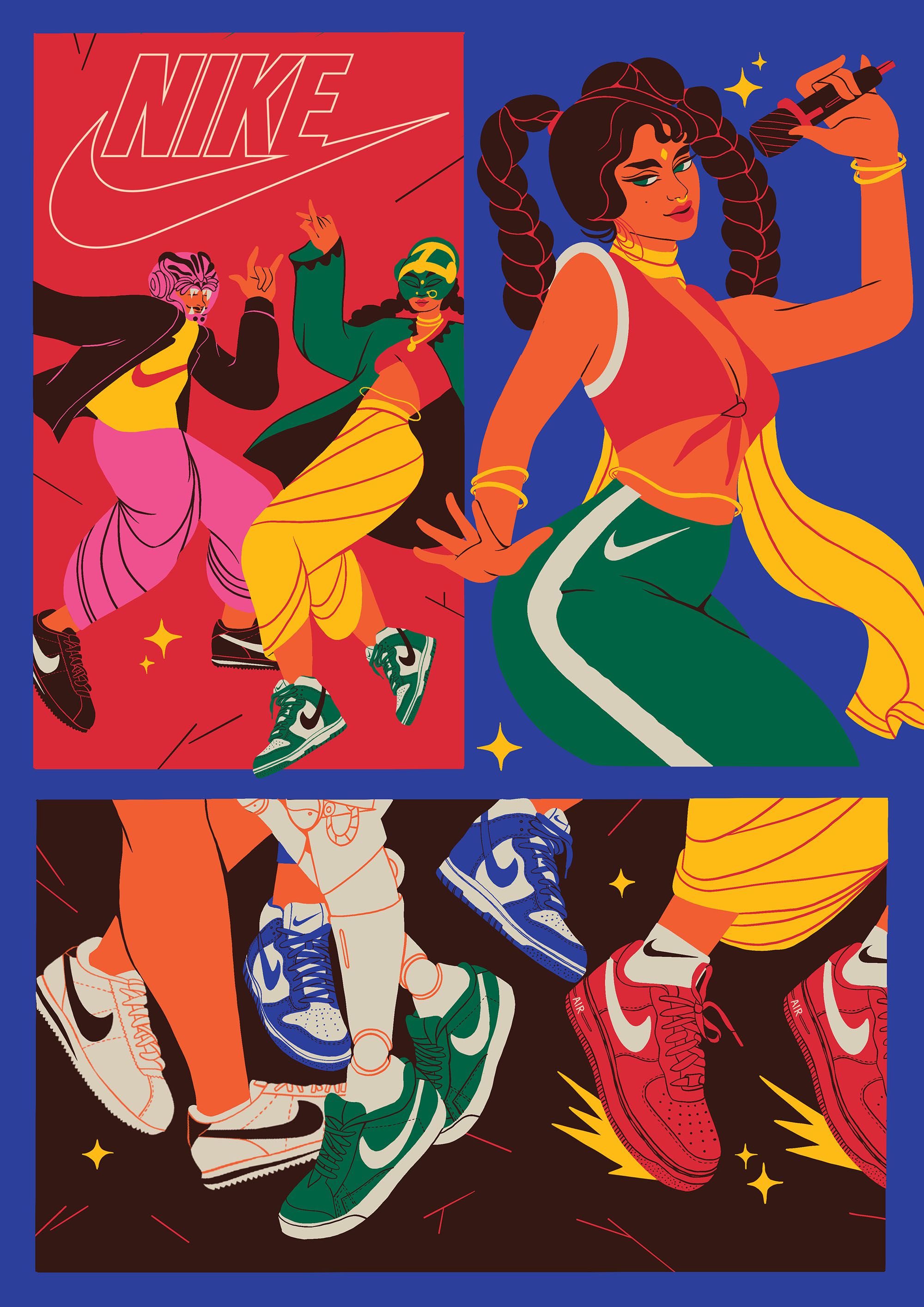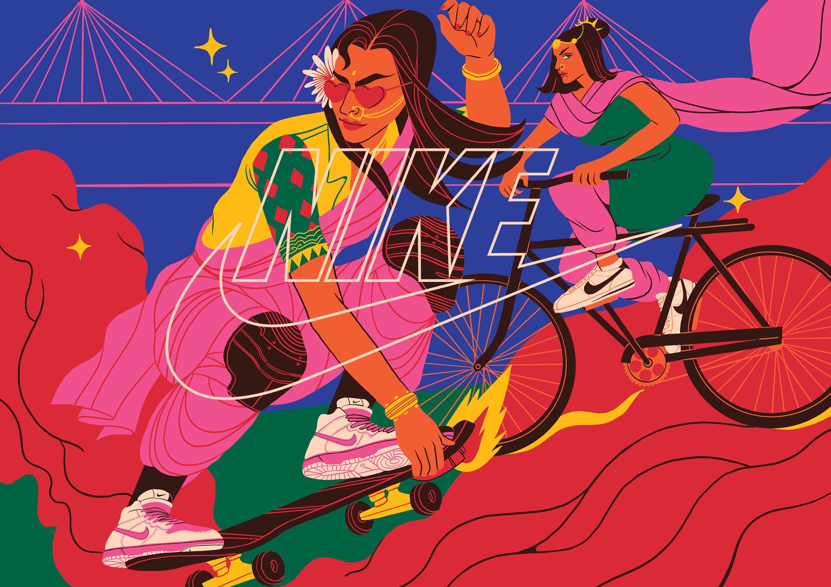 The illustrations depict Mumbai as an alternate future, rooted in its rich, extravagant cultural history and fuelled by technology. Depicting an optimistic worldview, Boomranng portray scenes of life with an unexpected twist, all keeping the iconic Nike design front & centre, from energetic dance-offs to bustling train journeys and a circus of animatronic animals.