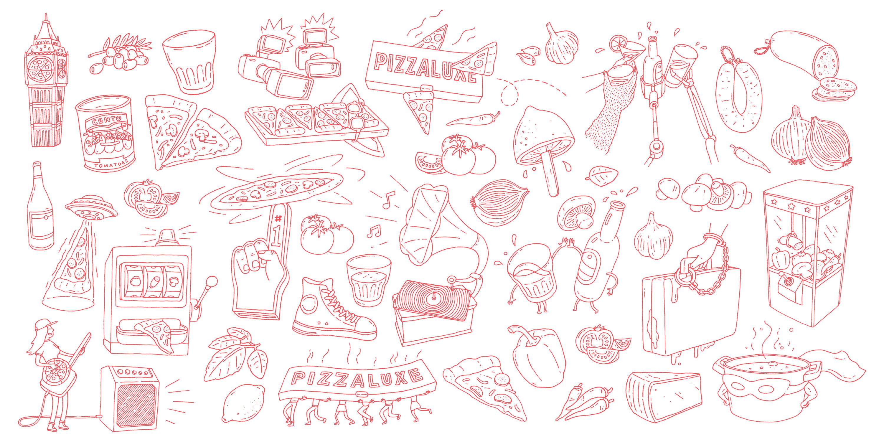 Damien Weighill brought Pizza Luxe’s rebrand to life through a series of hallucinatory illustrations bringing a playful sense of character to the brand.