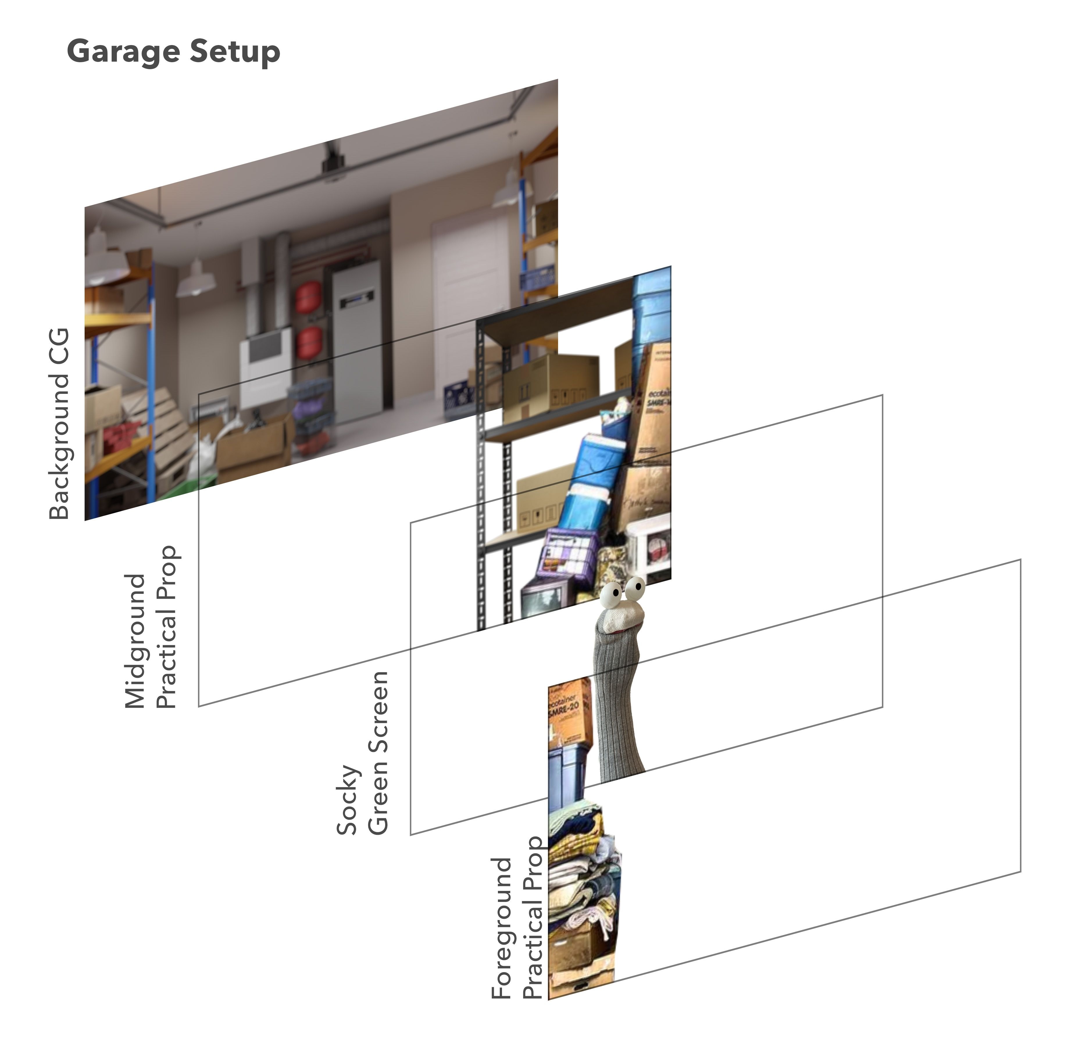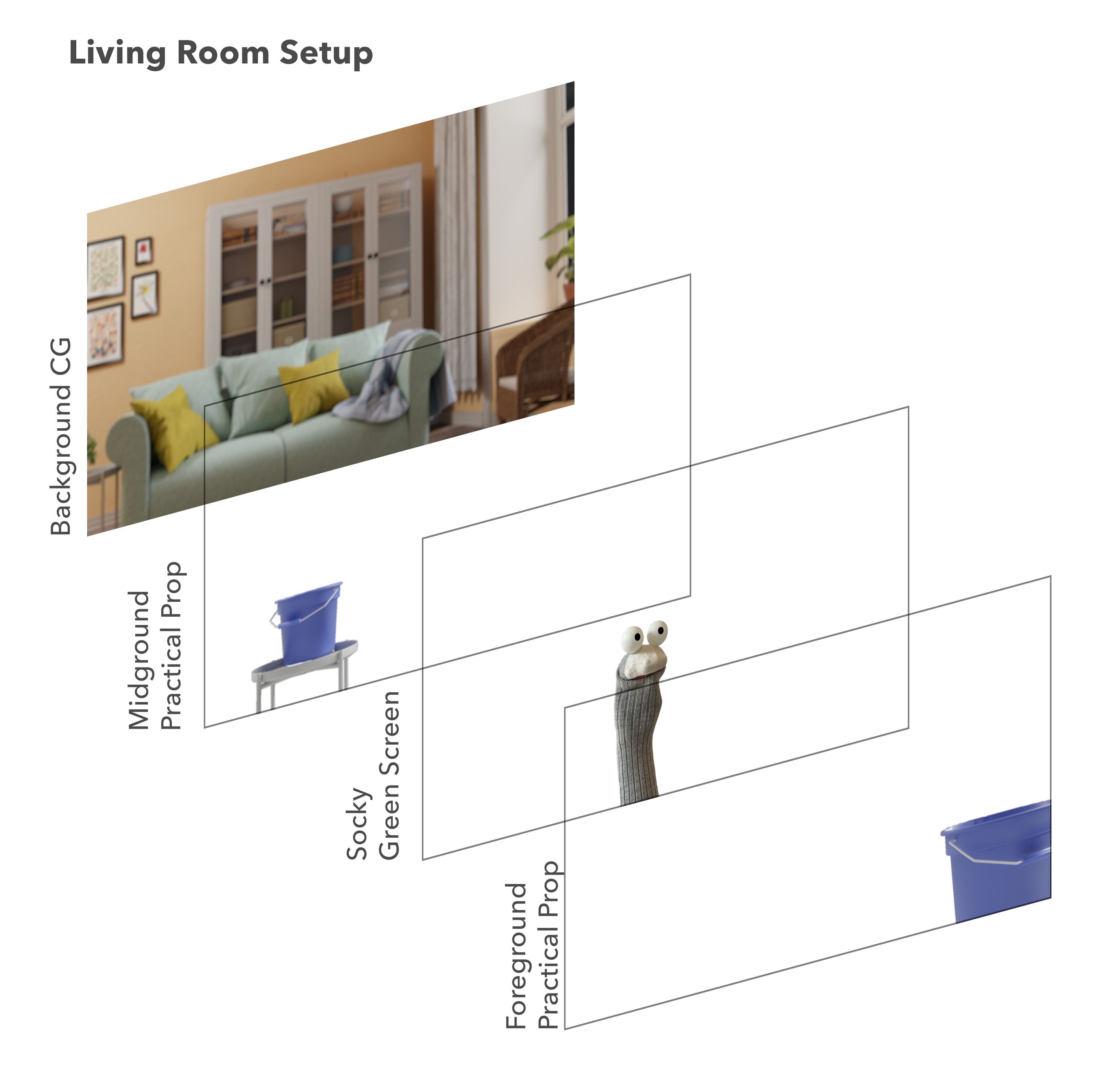 Once the 3D backgrounds had been designed, Practice formed a breakdown of how the various layers of the composition would come together to form the final scenes. Often opting to jump right into previs vs pencil sketches, Practice are able to quickly experiment with different compositions and speed up the process asa whole. Once the background has been designed, Practice fill in the elements that make up the composition and how Socky will interact within the space, setting the scene for the film as a whole and allowing Practice to move forward into adding the practical elements of the shoot.