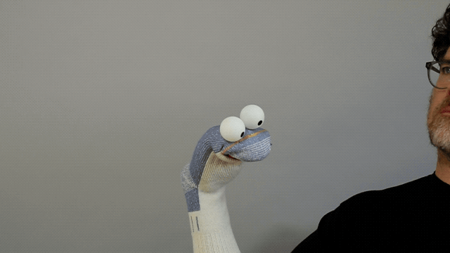 It was important to Thumbtack for Socky to look like a sock puppet, and not a muppet. Resulting in a lo-fi, not overly crafted design, but at the same time able to have exaggerated facial movements and heaps of personality. After trying various sock materials Practice settled on a wool sock with a white heel/toe combination that gives Socky a resemblance of a face to ensure stand-out characterisation. Next the eyes - foam, ping pong, googly, and half sphere were all tried to create the perfect fit.