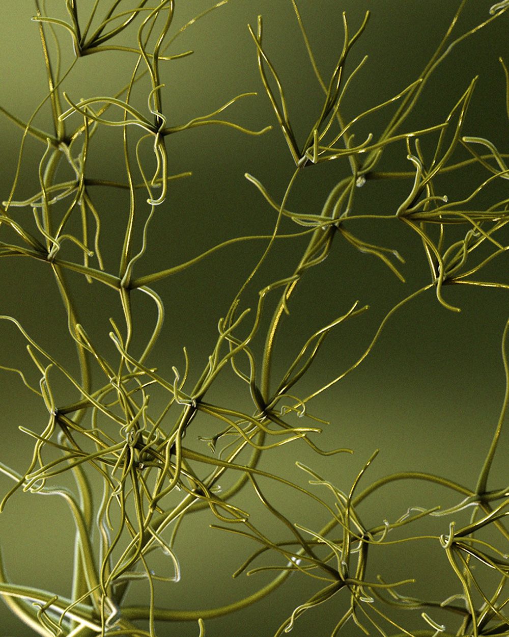 Meadowland Green is representative of a deep internal nourishment from our interconnected relationships with those around us and nature's own ecosystems. A floating seed, embodying new life, is seen to grow and expand, creating a network of organic branches.
