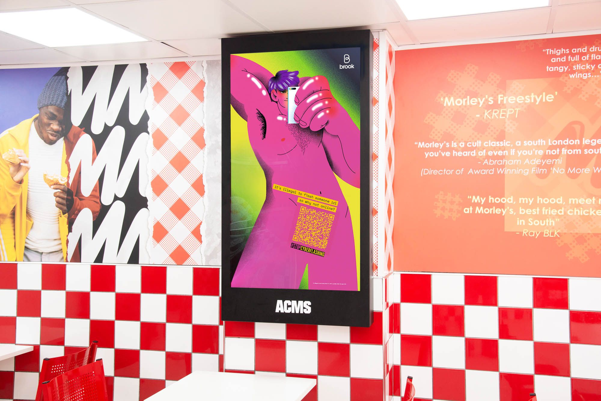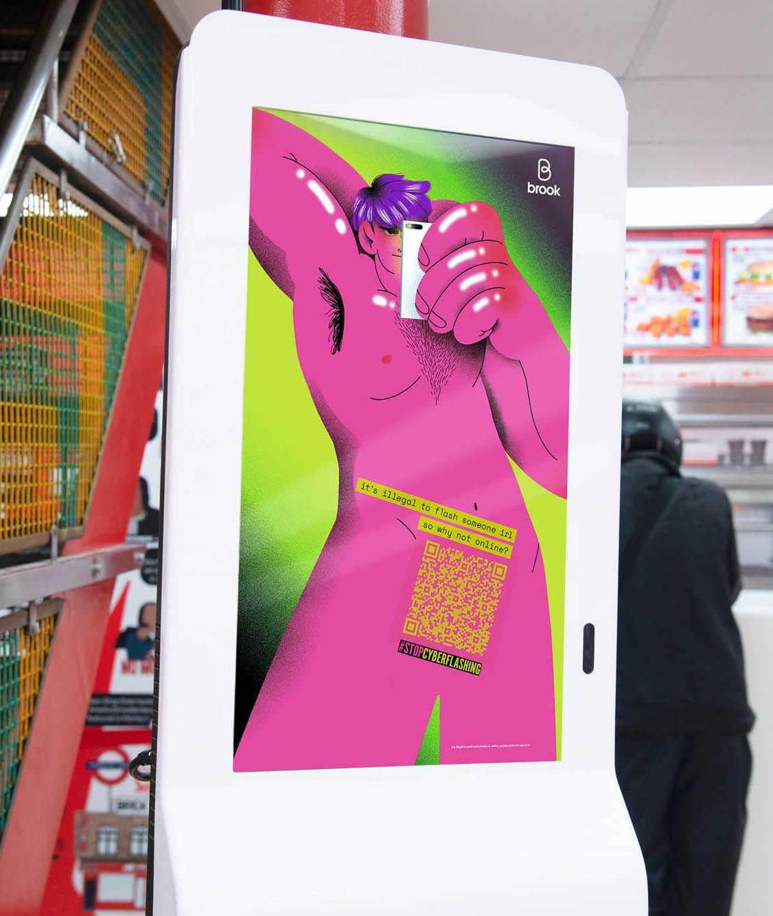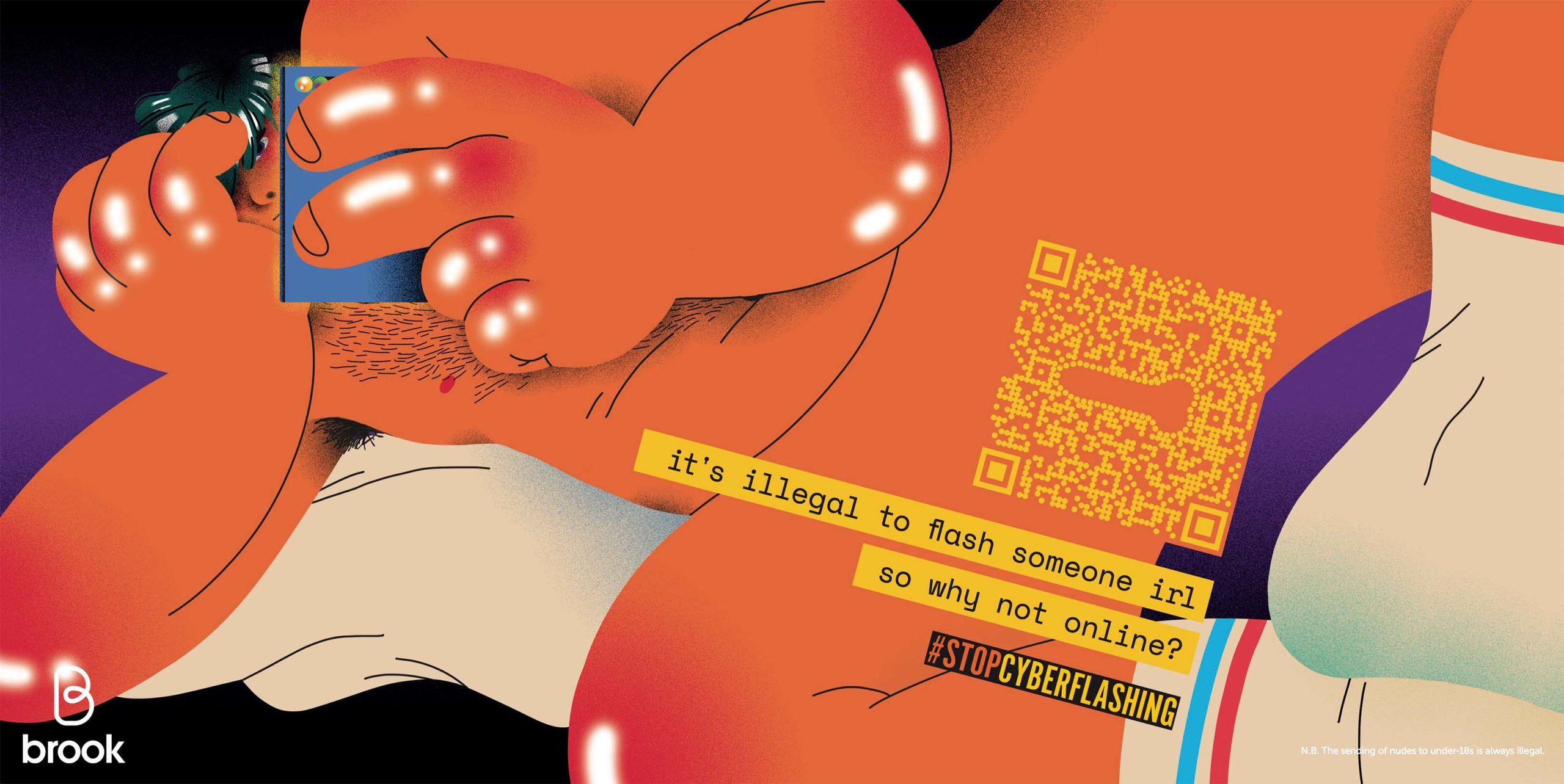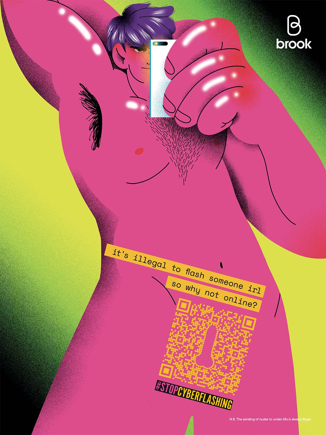 Genie’s work is typically bold and cartoonish, with this campaign being no exception. Grey London and Brook agreed that her style complimented the campaign by creating informative artwork that is striking but not triggering for those who have experienced cyber flashing. Due to the sensitive topic, it was decided that within the artwork the genitals are covered by a QR code which, when scanned, gives you the option to tweet your local MP and show support for the cause.