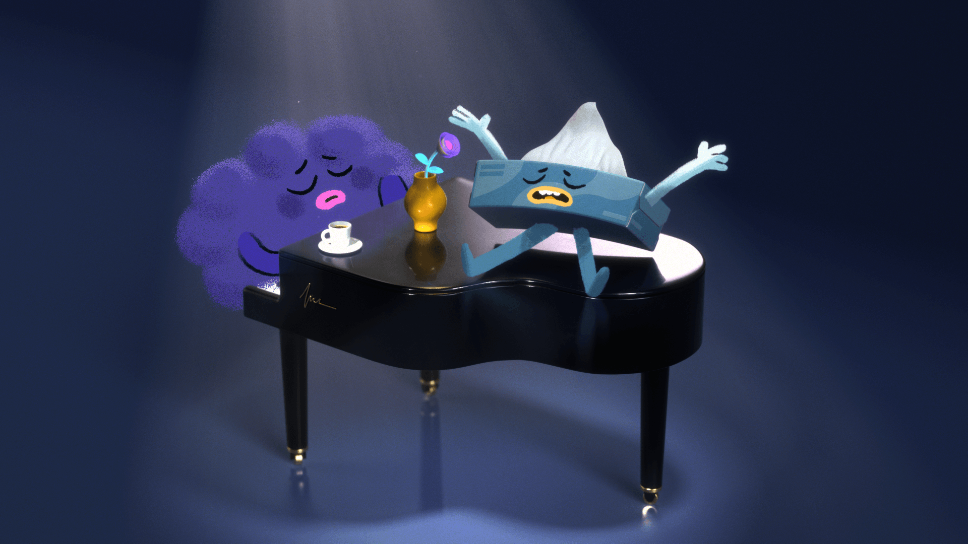 “Combining 3D environments with 2D characters is something that we love to explore and play with as we feel we get the best out of both techniques. By mixing these two worlds you get the beauty of lighting, 3D textures, and the use of camera movements combined with complete control of illustrating and animating the characters frame by frame.”